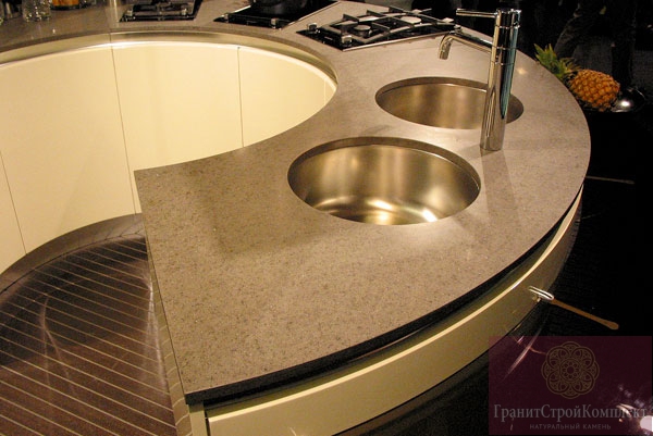 Кварцевый камень — это композитный материал, который содержит от 93 до 96% природного кварца и 4-7% высококачественной полиэфирной смолы. Одно из основных достоинств кварцевого камня — его уникальная твердость по шкале Мооса (она составляет 7 баллов, выше этот показатель у алмаза, корунда). На сегодняшний день кварцевый камень широко применяется при изготовлении предметов интерьера, в том числе столешниц в ванную комнату и на кухню. Выбирая, из чего сделать столешницу, необходимо, прежде всего, обращать особое внимание на эксплуатационные характеристики материала, которые с легкостью справятся с высокой влажностью, высокими температурами, жиром. Кварцевый агломерат отвечает всем требованиям современного покупателя. В отличие от натурального камня, агломерат устойчив к влаге, механическим повреждениям, высоким температурам, устойчив к воздействию натуральных красителей, не трескается. Нельзя не отметить внешнюю привлекательность предметов интерьера из кварцевого агломерата. При специальной обработке, специалисты изготавливают идеально ровные края изделий, благодаря чему швы соединения разных элементов практически незаметны. Характеристики: толщина изделий 10 мм, 20 мм, 30 мм прочность при изгибе 575 кг/кв.см (56,4 МПа) истираемость 0,08-0,09 г/куб.мм влагопоглощение 0,02 г/час термостойкость до 280 С твердость 7 баллов