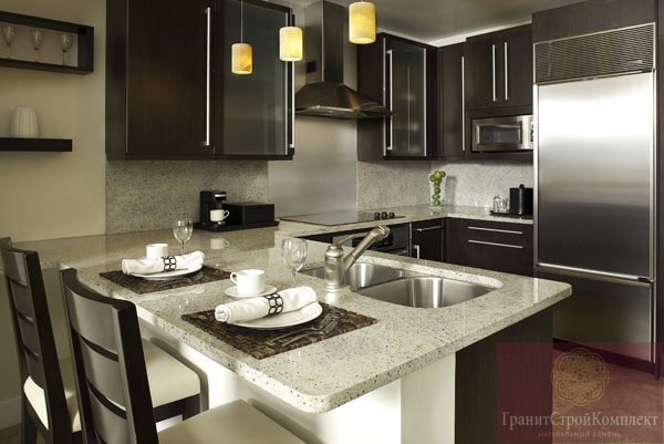 Выбирая, из чего сделать столешницу, необходимо, прежде всего, обращать особое внимание на эксплуатационные характеристики материала, которые с легкостью справятся с высокой влажностью, высокими температурами, жиром. Кварцевый агломерат отвечает всем требованиям современного покупателя. В отличие от натурального камня, агломерат устойчив к влаге, механическим повреждениям, высоким температурам, устойчив к воздействию натуральных красителей, не трескается. Нельзя не отметить внешнюю привлекательность предметов интерьера из кварцевого агломерата. При специальной обработке, специалисты изготавливают идеально ровные края изделий, благодаря чему швы соединения разных элементов практически незаметны.