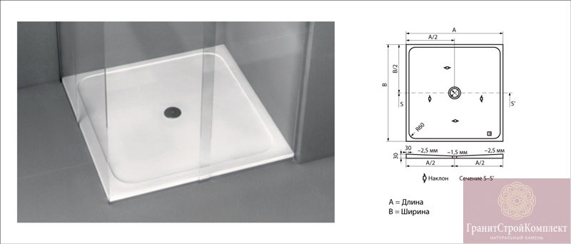 * для размеров свыше 120см включена зона сушки углубление к стоку